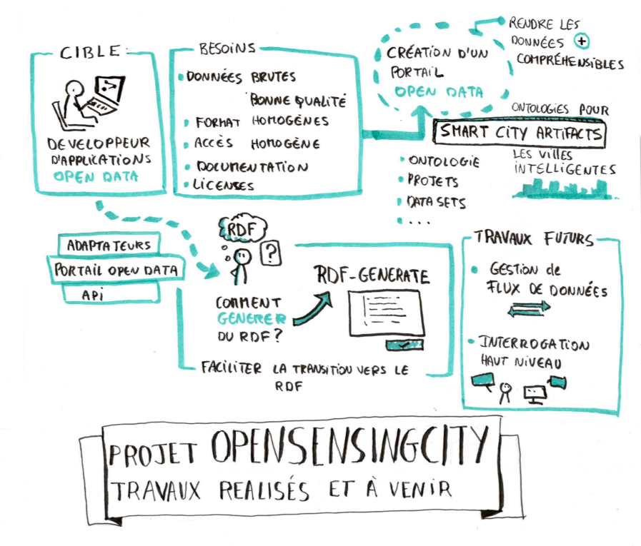Le projet OpenSensingCity financé par l’ANR vise à faciliter l’utilisation des données ouvertes dans le cadre des territoires urbains intelligents. Dans ce cadre, nous supposons que les données de capteurs déployés pour mieux gérer la ville pourront être mis à disposition sur des portails open data. L'ouverture de ces flux apporte des opportunités d'innovation en combinant les avantages usuels de l'ouverture des données à leur mise à jour en temps réel. Les données dynamiques et les flux permettent d'envisager le développement de nouveaux services au-delà de l'utilisation classique des données ouvertes pour la conception d'historiques ou plus généralement d'analyse a posteriori. Si la publication des données issues des capteurs au travers des plateformes open data est une première étape, il est nécessaire à présent de proposer des solutions pour simplifier leur utilisation. En effet, ces données sont en pratique difficiles à comprendre, à trouver et, en fin de compte, à exploiter. Ceci est d'autant plus vrai quand les données sont issues de capteurs car les contraintes de capacité et de communication obligent à minimiser l'information transmise. Par conséquent et afin de permettre le développement d'un écosystème de services urbains ouverts et intelligents, nous voulons fournir (1) des solutions technologiques pour aider à tirer profit de données ouvertes de capteurs pour les développeurs d'applications urbaines, et (2) des recommandations pour les acteurs de cet écosystème en analysant les stratégies d'acteurs, en définissant des scénarios d'usage et des terminologies. Pour atteindre ce résultat, nous combinons une analyse sociale des attentes, des exigences et des pratiques, avec une expertise technologique et technique en données liées et ingénierie des connaissances. La composante sociale doit assurer une meilleure compréhension des besoins des catégories d'utilisateurs de données ouvertes. La composante technologique se fonde sur des technologies du Web sémantique et des techniques de traitement de flux de données. Les résultats attendus sont l'enrichissement et la publication sur une plateforme ouverte, en tenant compte du nouveau paradigme des données liées, des flux de données et du raisonnement. Ceci sera faciliter par l’utilisation ou la construction d’ontologies des villes intelligentes, de même qu'un formalisme pour l'interrogation et la combinaison de flux. En outre, nous définirons des fonctionnalités de recherche et de navigation que nous mettrons en œuvre selon les attentes et besoins identifiés. Enfin, ces outils démontreront leur utilité dans une application qui aidera les conducteurs de véhicules à mieux trouver des places de stationnement.